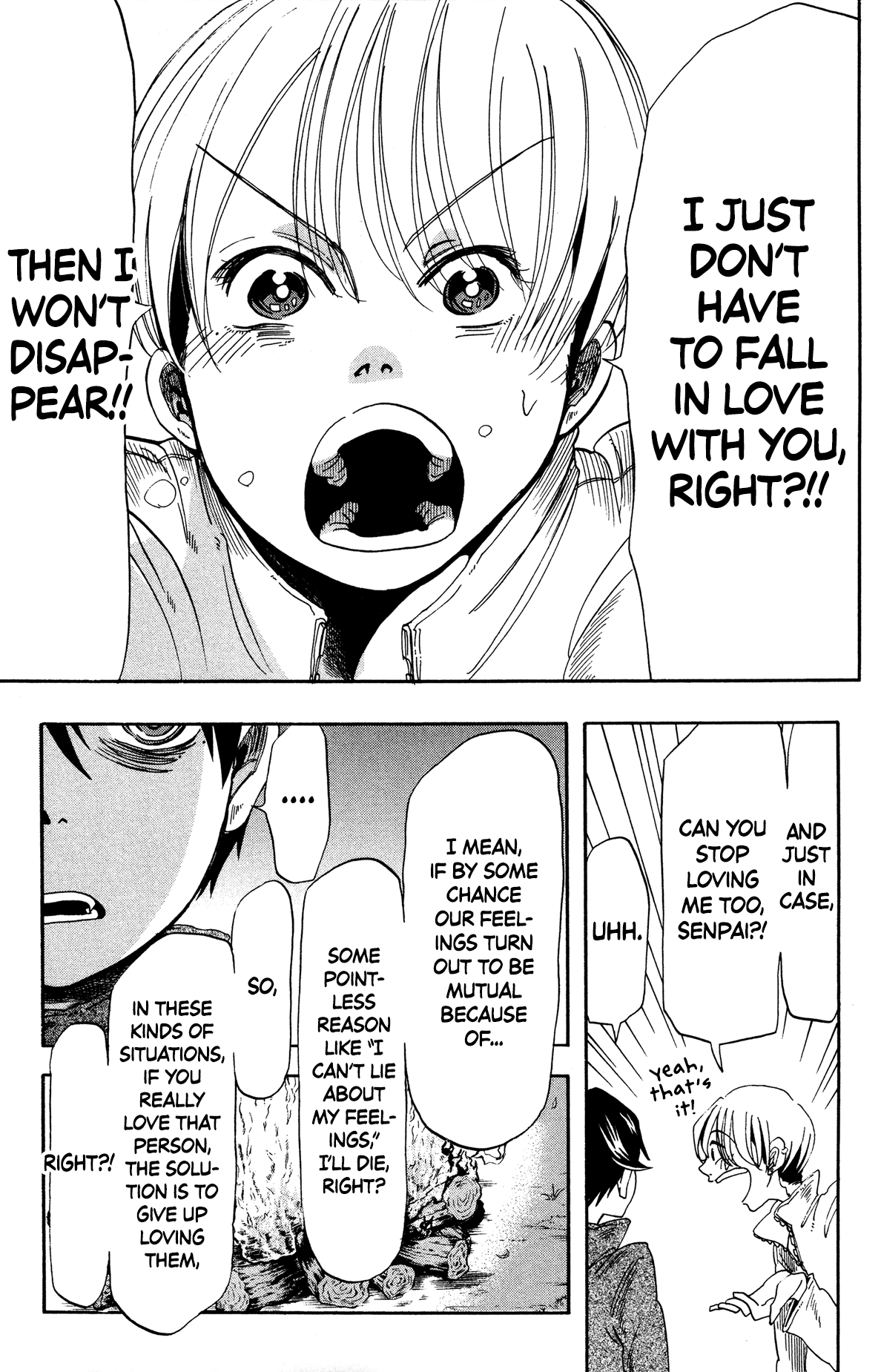 Jun stays by himself in the mountains, but sometime later, Rino returns, worried about him. Unfortunately, he ends up lost and injured. Jun finds him, and the two encounter a bear. In a desperate bid to escape, they make a Hail Mary leap into a nearby lake. Both are later rescued and taken to a hospital by Jun's friend, Tanaka. At the hospital, it is revealed that the jump caused Jun to suffer retrograde amnesia. Despite this, his feelings for Rino remain intact. Rino's internal conflict finally reaches its resolution when he realizes that he, too, harbors feelings of love for Jun. Bracing himself for the inevitable disappearance that comes with mutual love, something completely unexpected happens - this time, it is Jun who disappears. Everyone, except Tanaka, forgets Jun's existence. Tanaka, the sole exception, takes Rino to where Jun is now. In a surprising twist, it is revealed that Jun has reappeared as a female. This revelation reignites Rino's conflicting emotions, but he ultimately decides to be true to his feelings, just as Jun has been all along. With this resolve, Rino commits to chasing after Jun, fully aware that Jun will eventually disappear when Rino's love finally bears fruit.