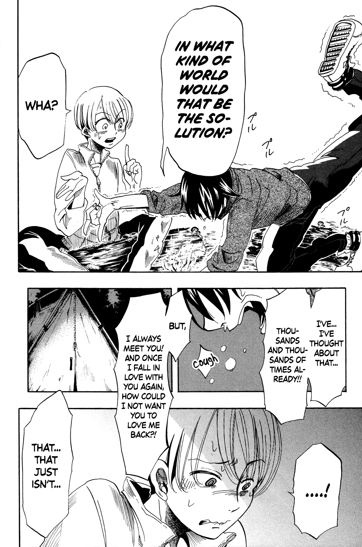 Jun and the Rino of this iteration share similar interests, which leads them to hit it off quite well. In one of the previous iterations, Jun had mentioned the fact that every time his feelings for Rino are reciprocated, she disappears - but that revelation happened near the very end of that plotline. This time, however, he reveals his love and the truth about Rino's disappearance to him much earlier in their story. Rather than treating Jun like he’s insane, Rino surprises Jun by inviting him on a camping trip (and a hunt for Tsuchinoko - UMAs are one of their shared interests). During the trip, they grow closer, and Rino offers his conclusion to Jun's predicament: he suggests that Jun give up on pursuing mutual love in order to preserve their current relationship. Jun has pondered this possibility countless times before, yet his answer remains steadfast - he will live true to his desire for mutual love, no matter how impossible it seems. He continues to profess his love for Rino again and again, which only deepens the confusion in Rino's mind, now filled with conflicting emotions. Finally, Jun urges Rino to leave him, insisting that the one thing he cannot deny is his unwavering love for Rino, despite the seeming impossibility of their being together.